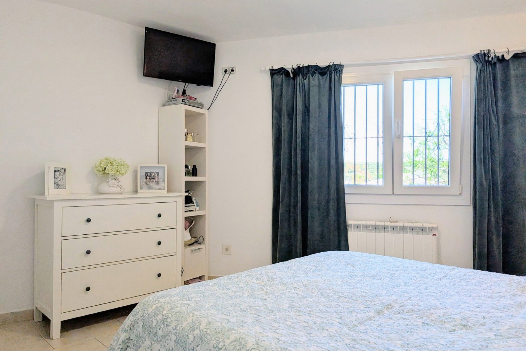 Cette villa traditionnelle impeccable, ensoleillée toute la journée, est située dans une rue calme en cul-de-sac à la périphérie de Moraira, à seulement quelques minutes à pied des commerces et restaurants. La propriété se trouve sur un grand terrain plat et rustique, ce qui signifie qu’elle ne peut pas être agrandie, avec une vue dégagée magnifique sur la vallée jusqu’aux montagnes, et même une vue partielle sur la mer.Depuis la route d’accès, une petite allée offre un parking suffisant et mène à un garage avec espace de rangement. Depuis le garage, un chemin plat mène à un escalier de neuf marches qui donne accès à la villa et à la terrasse avec piscine.Vous entrez par une naya ouverte avec une vue splendide, un endroit idéal pour profiter des couchers de soleil à l’ouest. La porte d’entrée mène directement au spacieux salon avec cheminée et une fenêtre donnant sur la piscine. Une arche mène à la salle à manger, un espace lumineux avec des portes vitrées vers la naya et une fenêtre. À gauche du salon se trouve la cuisine, équipée d’armoires crème brillantes et de plans de travail en granit, comprenant un four, une plaque de cuisson au gaz, une hotte télescopique, un lave-vaisselle de 45 cm, une machine à laver et un réfrigérateur. Il y a aussi un cellier.Un couloir mène aux chambres et à la salle de bain. D’abord, la deuxième chambre, une pièce spacieuse avec armoires encastrées, climatisation et fenêtre donnant sur l’arrière du jardin. Ensuite, la salle de bain magnifiquement rénovée avec douche à l’italienne, meuble-lavabo avec vasque en verre noir et sèche-serviettes électrique.La terrasse de la piscine est privée et très spacieuse, avec une vue ouverte splendide. Elle dispose d’une pergola pour se détendre à l’ombre, une table avec des chaises pour les repas en plein air, un barbecue, une table basse avec des fauteuils, et suffisamment d’espace pour des transats.Le terrain autour de la villa est composé de pelouse, plantes, arbustes et plusieurs amandiers – il y a tant à faire avec tout cet espace disponible. Il existe un accès à un espace de rangement sous la naya avec une hauteur sous plafond limitée.